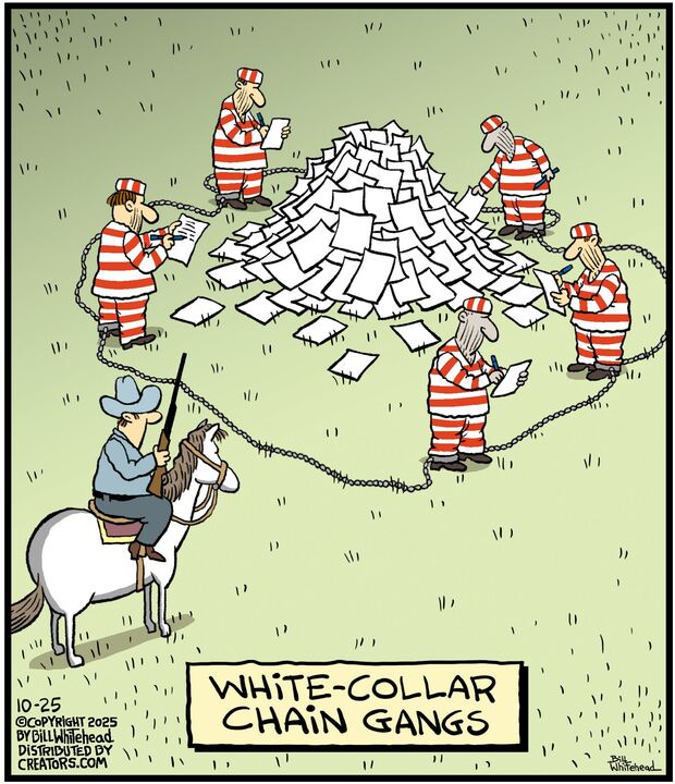 Bill’s career in cartooning started in the fifth grade, when he would copy drawings from comic strips, the New Yorker magazine and editorial cartoons. After a while he developed his own style, focusing primarily on the drawing. He soon realized his characters would need something to do and say, so he gave them their own odd little world to live in. Soon everyone around him became fair game. By college, Bill was cartooning for the school paper. Later, he created posters for book and record stores and freelanced for the Saturday Evening Post, Advertising Age, the Boston Phoenix, Wall Street Journal and King Features. In the '80s, he syndicated Sidelines, a sports panel cartoon.