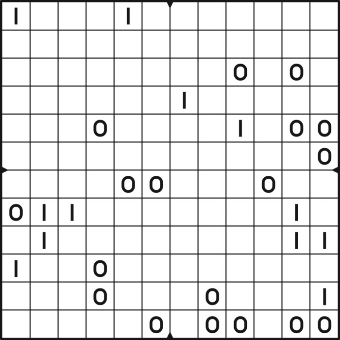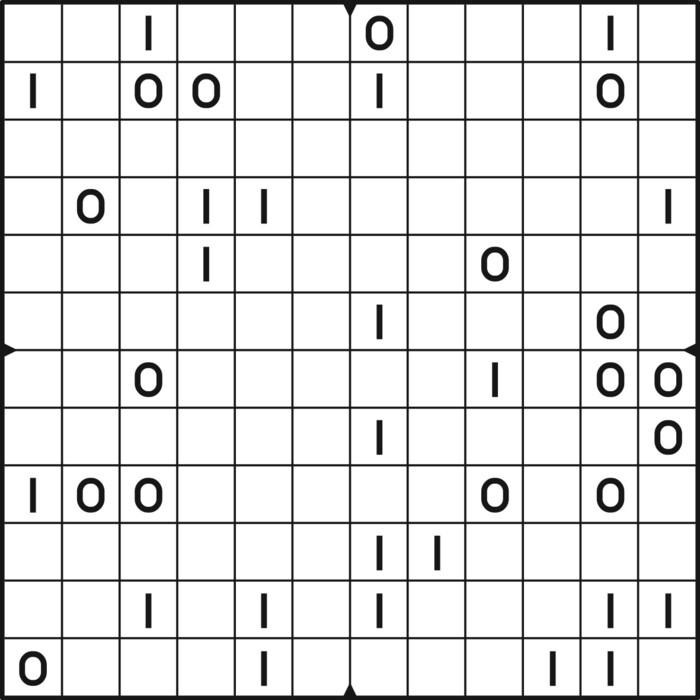A daily binairo puzzle! Solve each puzzle with only 0's and 1's. Remember: No more than two the same numbers may be placed directly next to or below each other. Every row and every column must contain as many zeroes as ones. The combination of zeroes and ones in every row must be unique, as does the combination in each column.