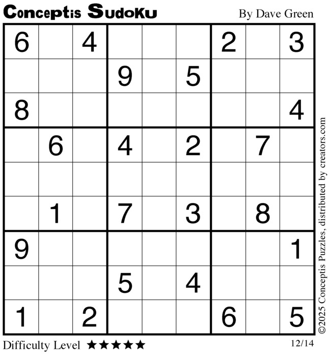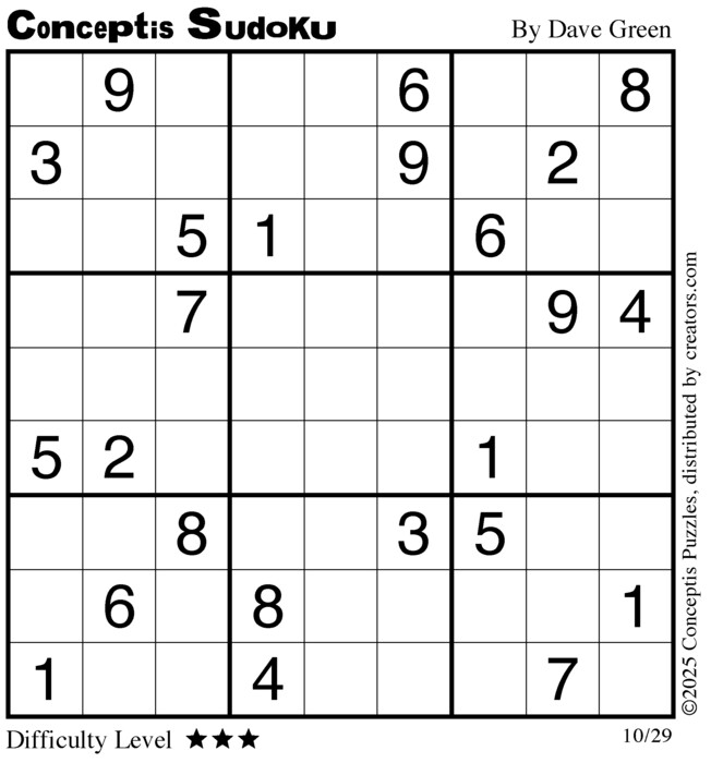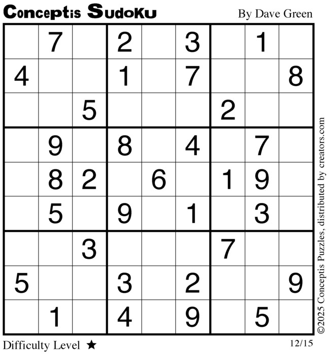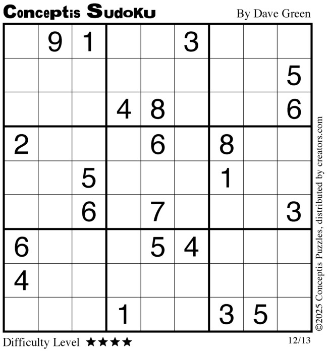 Each puzzle consists of a 9x9 grid containing given clues in various places. The object is to fill all empty squares so that the numbers 1 to 9 appear exactly once in each row, column and 3x3 box.