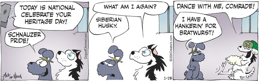 Dogs of C-Kennel, created by Mick Mastroianni, was featured as a comic strip in development in February 2007. Syndicated in 2010, the Dogs are now produced by Mick and his brother, Mason Mastroianni, B.C. cartoonist and Wizard of Id Illustrator.