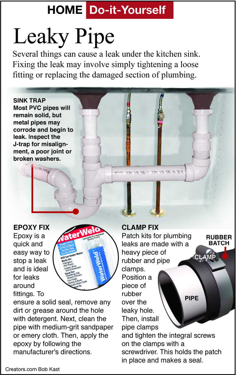 Dear James: I have a very tiny leak in one of the drain pipes directly under the sink. Is there a simple DIY fix for this so I can avoid having to call in a plumber to replace the pipe? — Miriam F.
